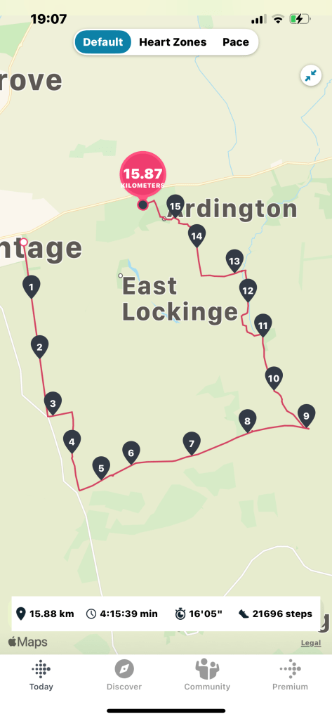 The route map shows where the battery ceased, so I had to measure the remaining section manually. Therefore I didn’t finish the walk in the middle of a wood but back at my house. The total for this walk was 18.3km. A great walk in the sunshine which I really enjoyed.