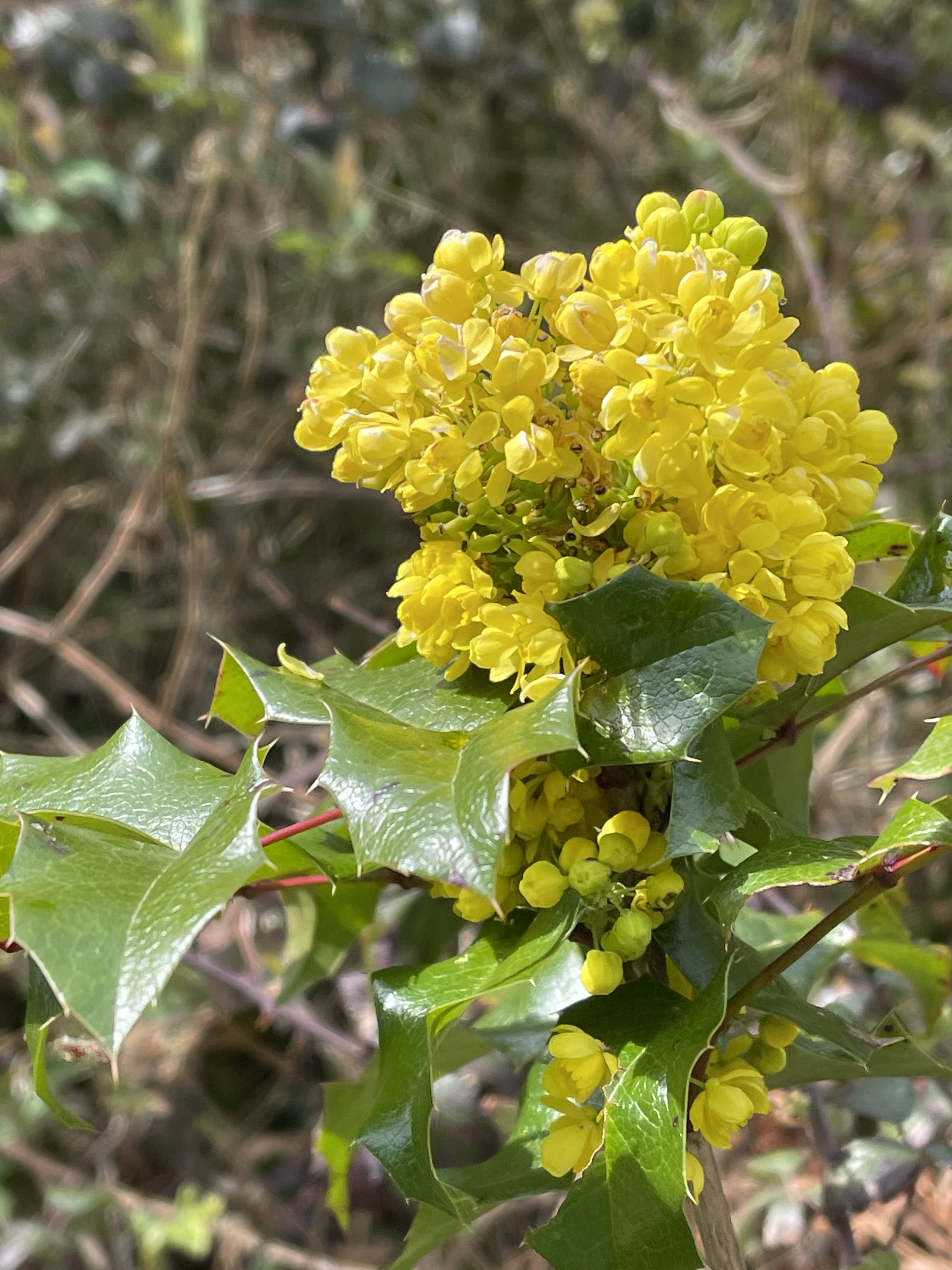 Passed where I parked last time with Alex J and along the road a bit before crossing fields to a wooded area. Definitely time for a comfort break – this has been the first opportunity and a chance to eat a sandwich, a rather late lunch but I did have cake with my coffee earlier! The most striking part of this walk through the wood is the abundance of a particular yellow flowering plant, as well as some gorse. It looks similar to something I have in the garden but I thought that was cultivated? Again the rather useful feature allows me to name it as Berberis aquifolium – Oregon grape. I really don’t think I ha be seen it wild before.