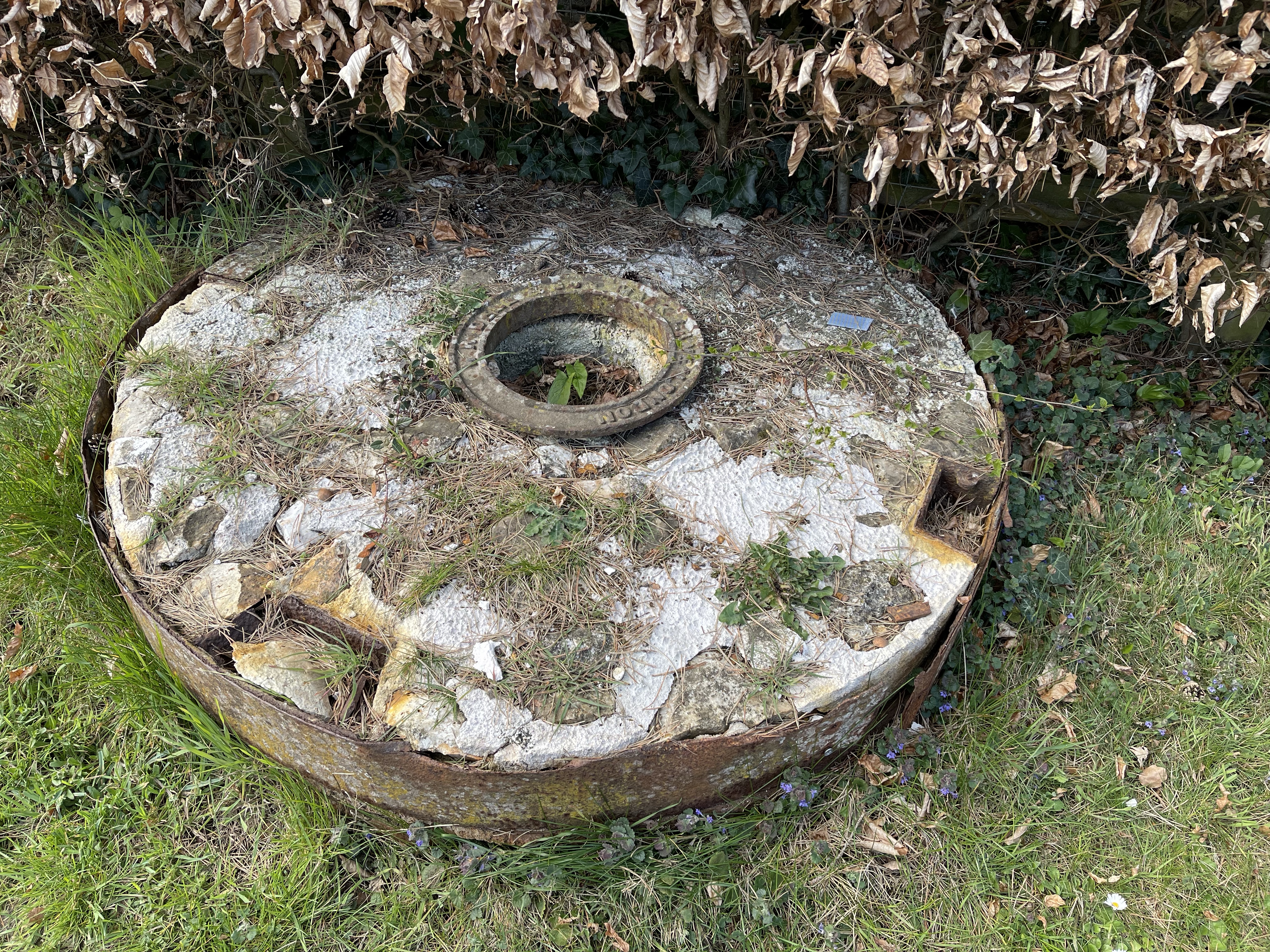 A bit further through the larch is beginning to show it’s new growth – a wonderful bright but gentle green. This path comes out by yet another Home Farm and this rather splendid hexagonal building – too grand to be a dovecote? And then by the side of the track this stone – not quite a mill stone but could be- a mystery to be solved.