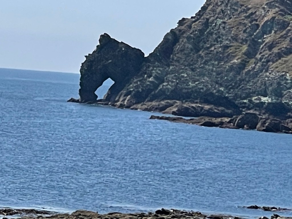 Quite quickly the path cuts diagonally away from the road and then goes steeply downward- a little unnerving as not much grip and a large expanse of nothingness in front of you – quite quickly it turns a little to the right and feels much more comfortable! This path, narrow in places and teetering along the land edge has wonderful views of rocky outcrops. I stop to photograph one of these and remember Jack clambering across to explore and also watching seals. I think I can see one out on the rocks but is this wishful thinking?