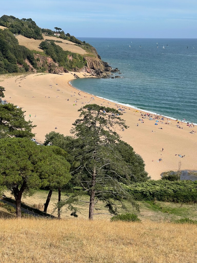 The path cuts in land for about half a kilometre and then at the parking turns left onto a road. There is quite a section next along road and that bit further inland. The land is so undulating at this point, not rocky as in some of the outcrops yesterday but huge rounded fields which dip to steep valleys. The road takes quite a turn as it hits the head of one of these gorges then continues towards Stoke Fleming. This is a narrow village approach by a winding steep road with cars everywhere, this had been a challenge for the bus driver a few hours earlier! The route cut through the village luckily away from the chaos of the main road and then steeply down to meet the coast again just before Blackpool Sands.
