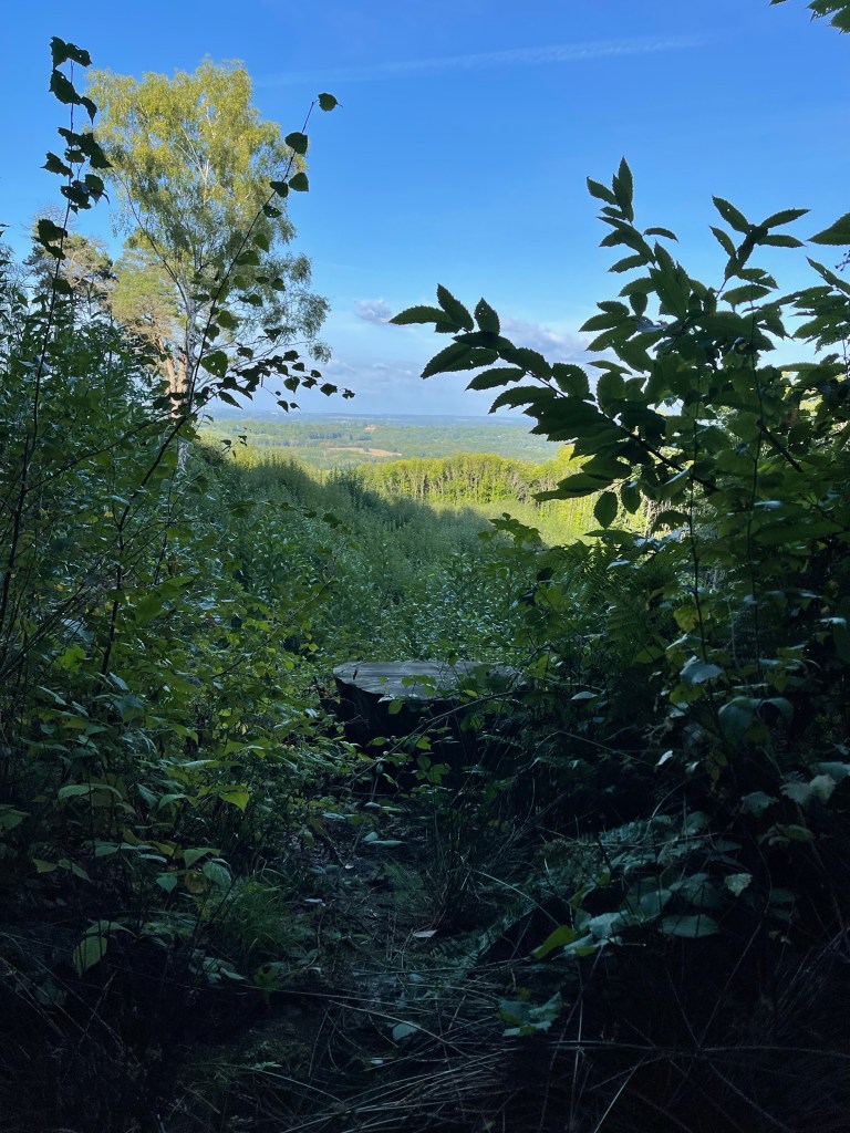 My path cuts across the Polecat Valley and I decide to not go up to the Devil’s Punchbowl car park as the leaflet describes but cut off a corner. Almost as soon as I do this it seems rather familiar and I realise I’d been on this path last February with a two legged and a four legged friend! The sun was shining then as well. Confirmed my position when I came out on a clearing with a small bench where I had sat before.