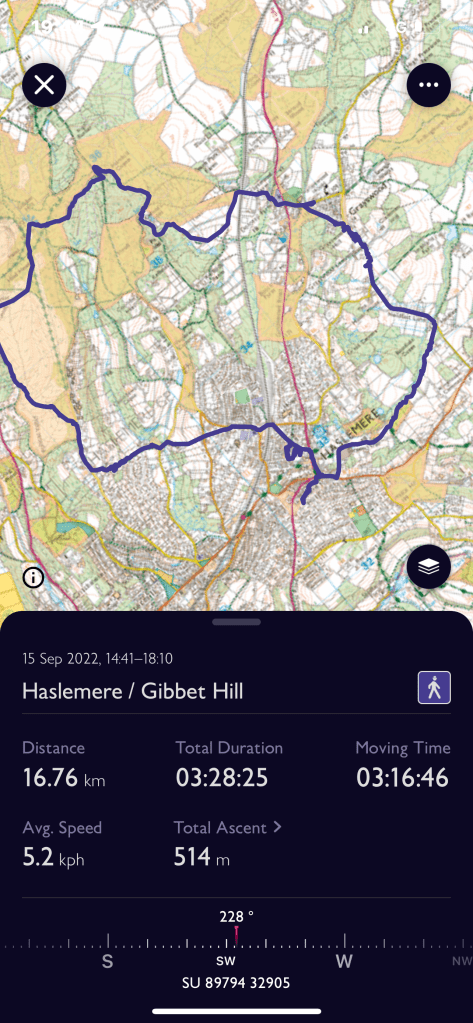 Kink in the path and then started to turn and really go down hill. Text message – my friend who I was meeting for a drink was going to be back in Haslemere at 5.30 – over an hour earlier than I had expected!! And I’m about as far away as I could be. I try to speed up but know I still have to be careful going down hill with tree roots etc. Going splat won’t make me any faster!