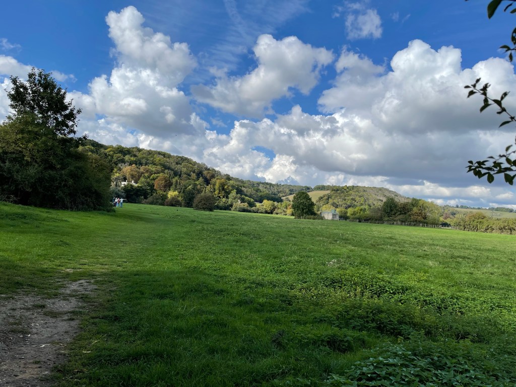 Our path takes us up high above the river into some woods and this gives a completely different perspective. I’ve walked all of this section from Goring earlier in the summer. They like this wooded path more than I anticipated. Although we haven’t been close to the river we are now further away as we take a look across to Basildon Park and then cut round the side of Coombs Park. Discussion is now centred as to where George Clooney might live!