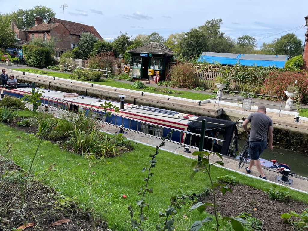 At Reading bridge, a newish footbridge we discover there is a cycle event – explains a lot! We have housing on our right but some interesting islands and barge / cafes over the river – which we could reach if we had more time. Another lock – Caversham and soon after the boat yard which was referenced the day before. After a busy section the area to our right widens out again and becomes King’s Meadow with beautifully green grass and a recreational feel even though there is obviously a busy town on it’s other perimeter.