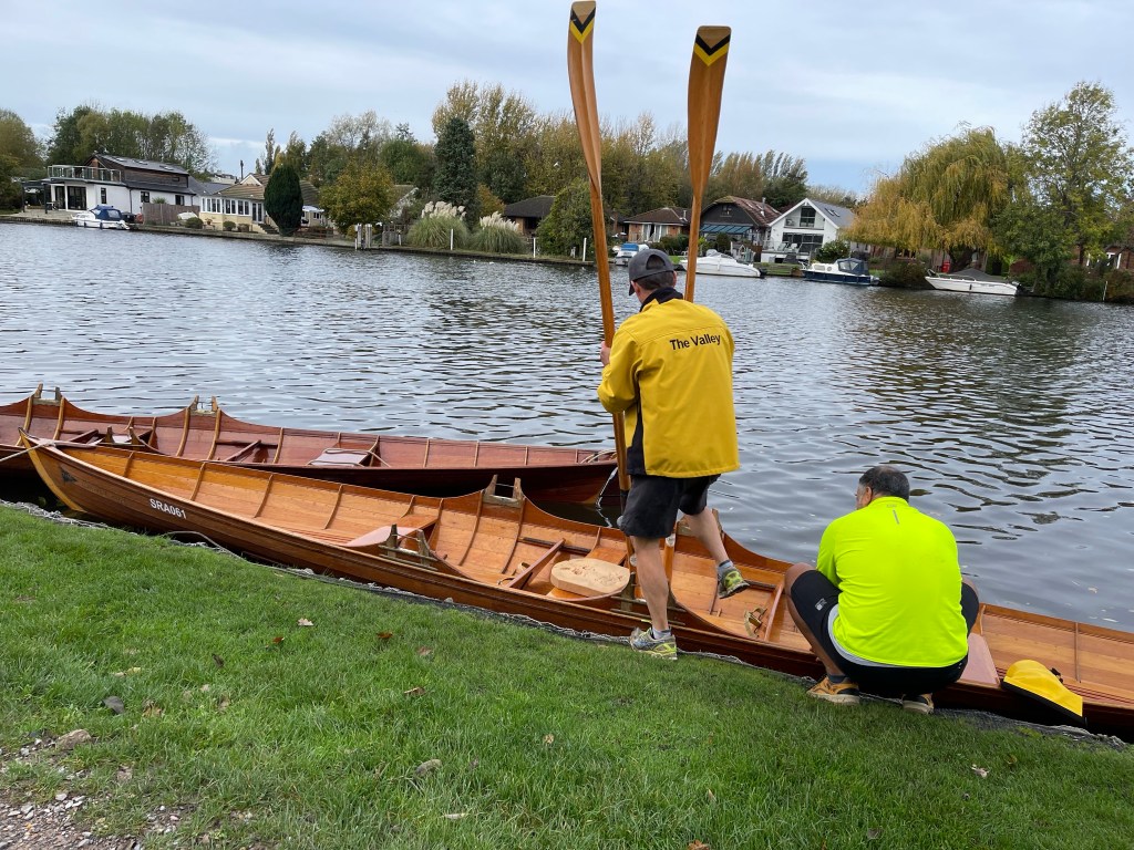 We soon approach Walton on Thames and again we find evidence of a previous life on the river which was more commercial and less leisurely. We are walking alongside houses for a while but as the other side is quite open it still has a feeling of ‘openness’. We have Anna’s husband Andy with us today so we are still six. We notice a rowing and skiff club but we’re not sure what that entails. A little further along and our question is answered as another boat house was opened up and people were busily gathering oars. Fiona found out that these wider, more stable boats are often preferred by older rowers!