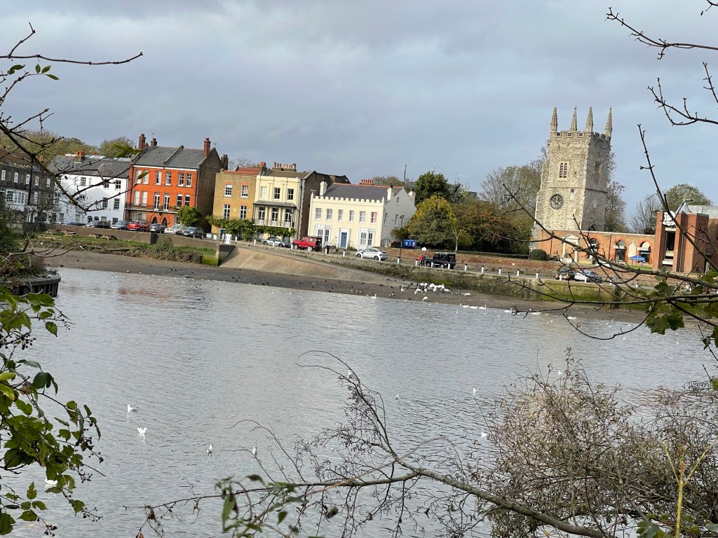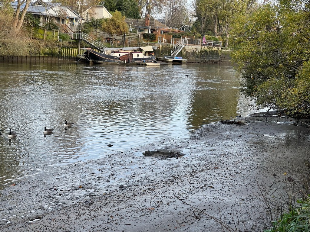 Our side of the river which curves a lot at this point has quite a rural feel – Ham Lands Nature Reserve and we are walking through a pleasant avenue of trees. We are looking out for Eel Pie Island which had quite a reputation on the music scene several decades ago. We realise that the bridge over to it must be on the much more populated Twickenham side, at one time there was a rather notorious ferry service! Shortly after the island we can see Marble Hill House, the first of several grand buildings along this stretch. The tide looks quite low at this point, the first time we’ve seen it like this.