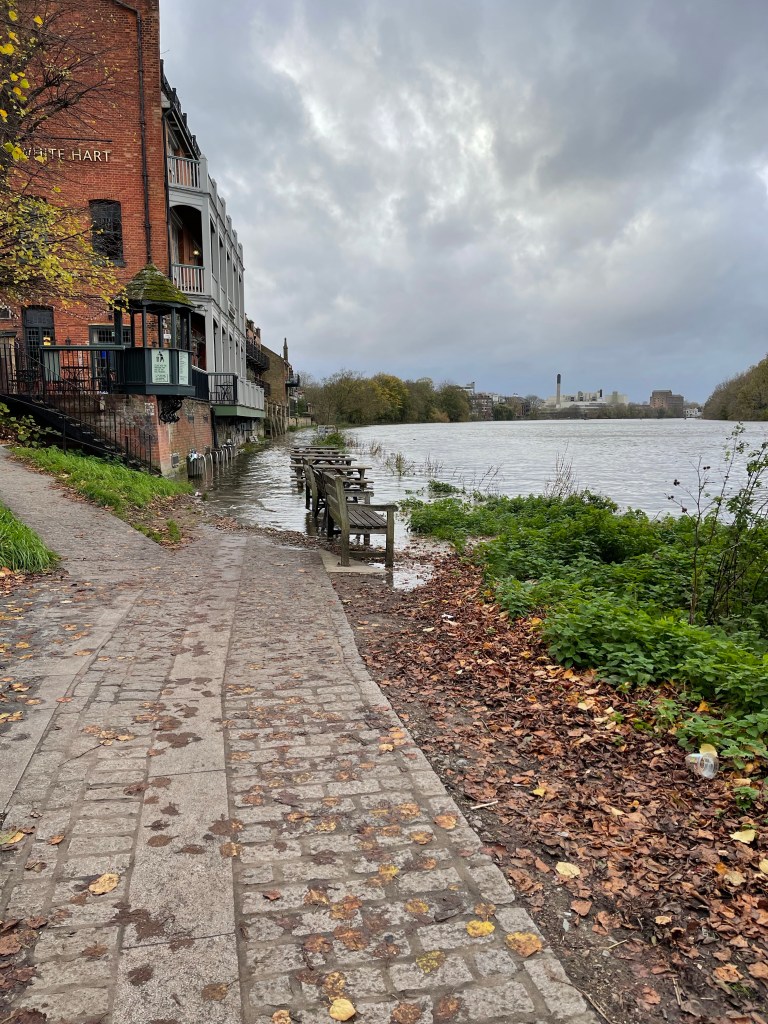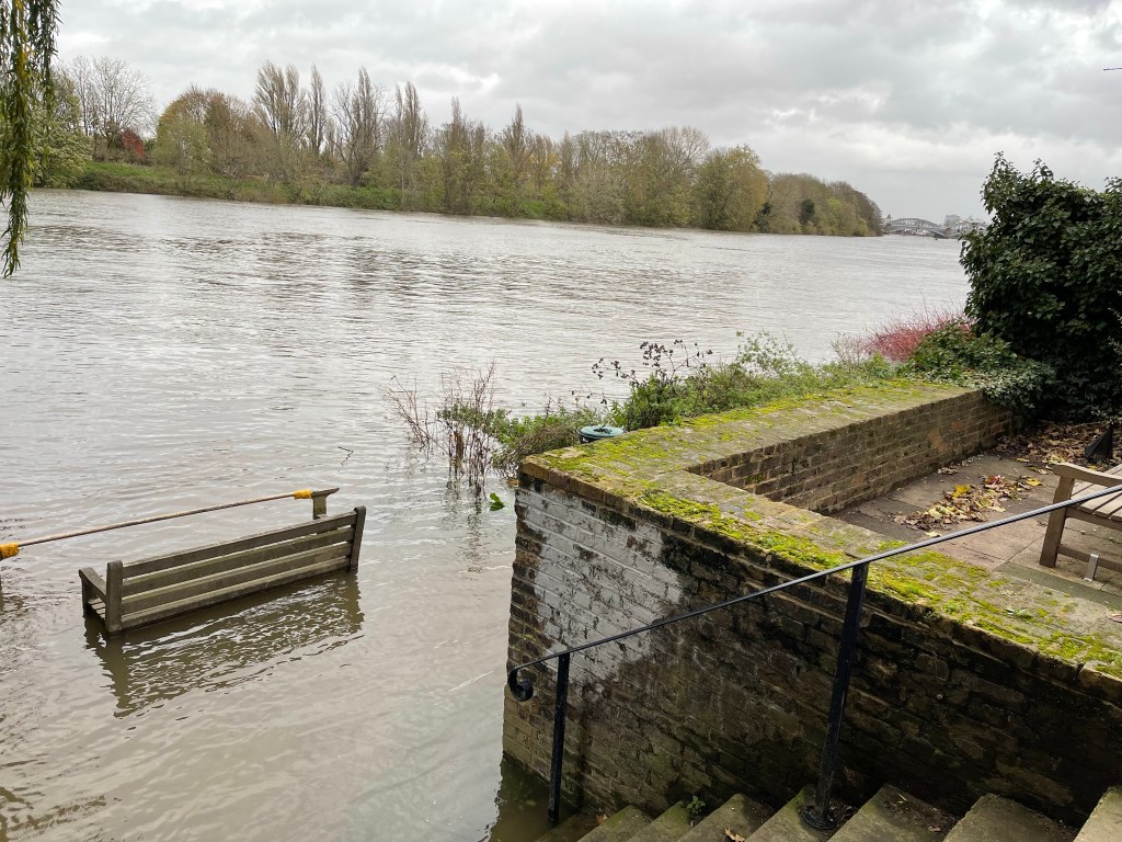 We pass Kew Palace, once of royal significance and then it’s under Kew Bridge. We wonder about coffee and lunch but no where is obvious. Interesting to be in this area having stayed by Kew Green and visited the gardens several times, a completely different perspective from the river. We almost back track on our selves heading south again as the Thames continues its loop. We pass the National Archive Centre – I wonder how many secrets are hidden there. Next we pass under Chiswick Bridge, we have noticed that the tide is coming in but we’re perhaps a little preoccupied with the need for a toilet stop. We arrive at a pub next to a slip way with the water creeping up it. We spot a sign which points to community use toilets down a road which is a continuation of the slip way. At the same time a fellow walker comments ‘ You better be quick or you won’t get through’.