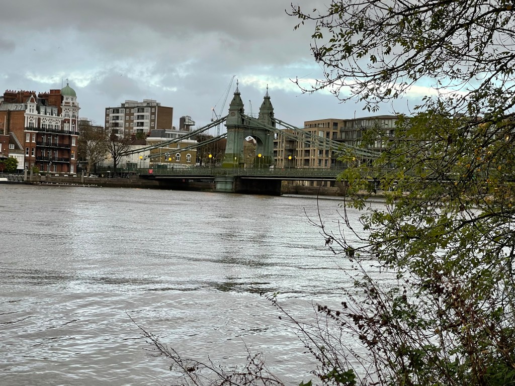 We concluded that it must be a particularly high tide; this situation had really surprised us. Barnes is enclosed on two sides by the river as it bends in a tight loop again. Lots of signs to a Wetland area – quite s few things you could explore further along our route and also an urge to walk on the other side and look back across. We reach Hammersmith Bridge which is now closed to motorists and was at one time also closed to Pedestrians. We also notice a ‘tide mark’ where the water at high tide has moved the leaves on the path.