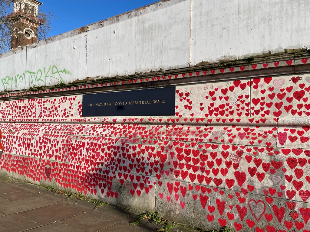 As we were approaching this section there were more people stopping and taking photos and we had to work harder to keep together as a group. The memorial wall for Covid deaths is something which gives a stark reminder of the last few years and volunteers are continuing to paint and repaint hearts.