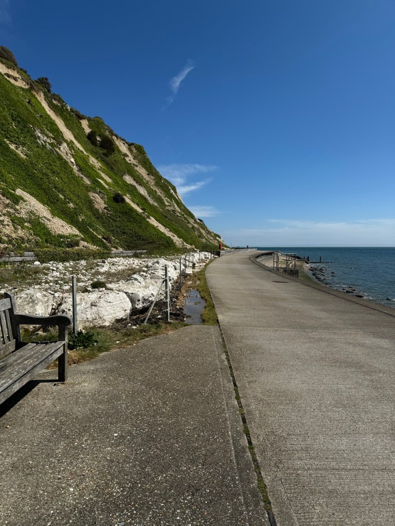 Onwards and a little closer to the sea front but with the coastal path staying above it. Past Shanklin Chine, a popular spot to visit. The coastal path stayed a little above the beach all the way along towards Sandown. I could see white cliffs in the distance which I knew would be part of the final day.