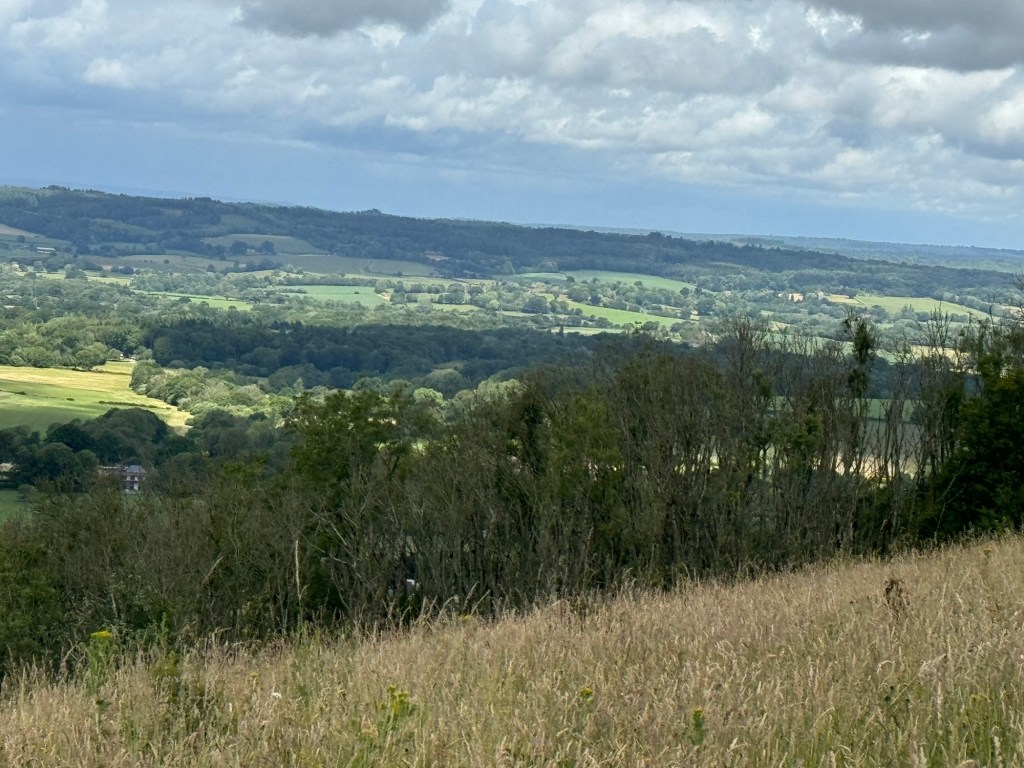 Didn’t pause for long, waterproof on and quite a downpour – wet grass, wet boots – again! I’d been looking forward to this section as the views were out over familiar places. Friends from school had lived in Totton and Elsted, camped as a guide at Stedham and can still remember the very dramatic thunderstorm one night. More recently walked at Woolbedding and then of course there is Midhurst itself.