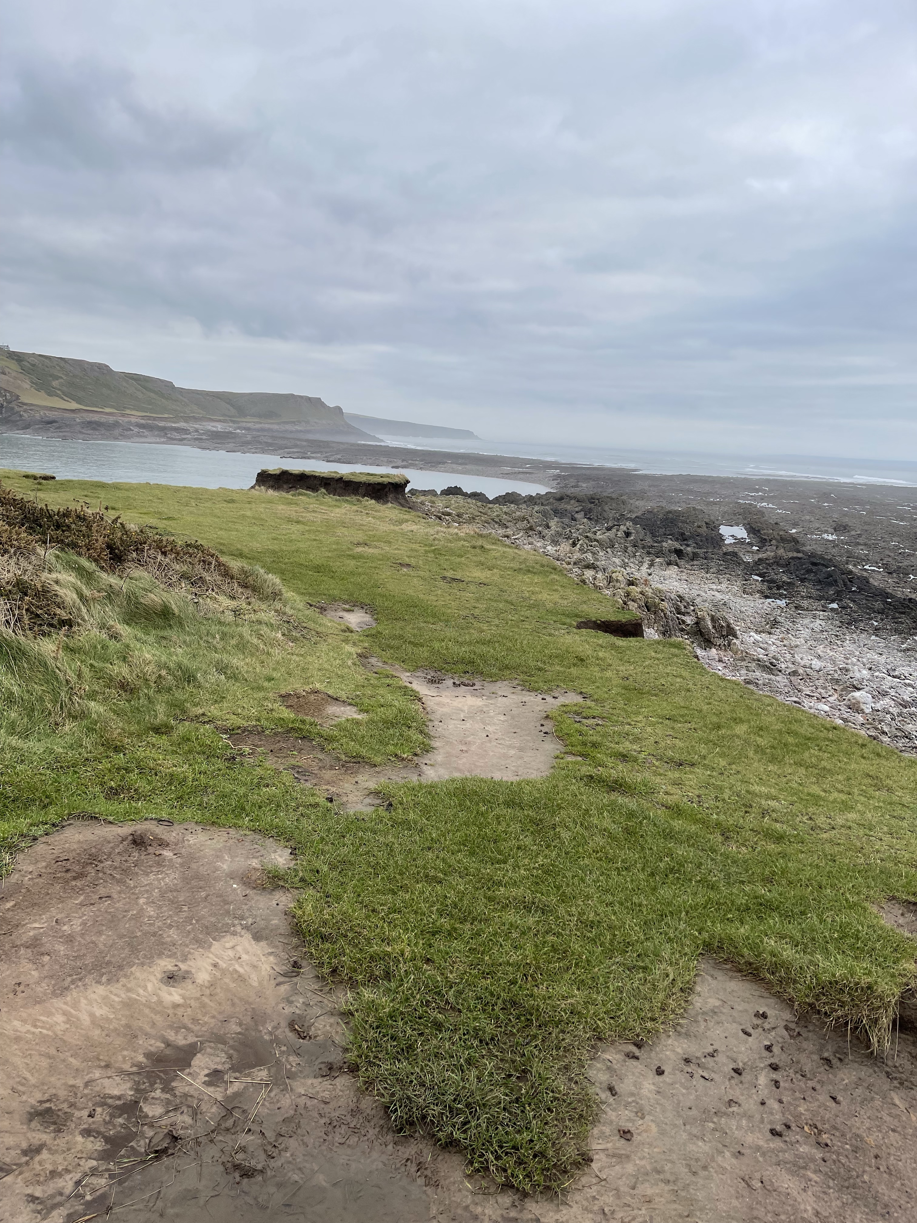 After climbing up a bit further we start a descent down towards a caravan site but decide not to go through it and down through sand dunes to the beach. Our path will take us along the foothills of where we have just walked and then hopefully down to the beach. I should have known there would be scrambling down a steep grassy slope at some point!