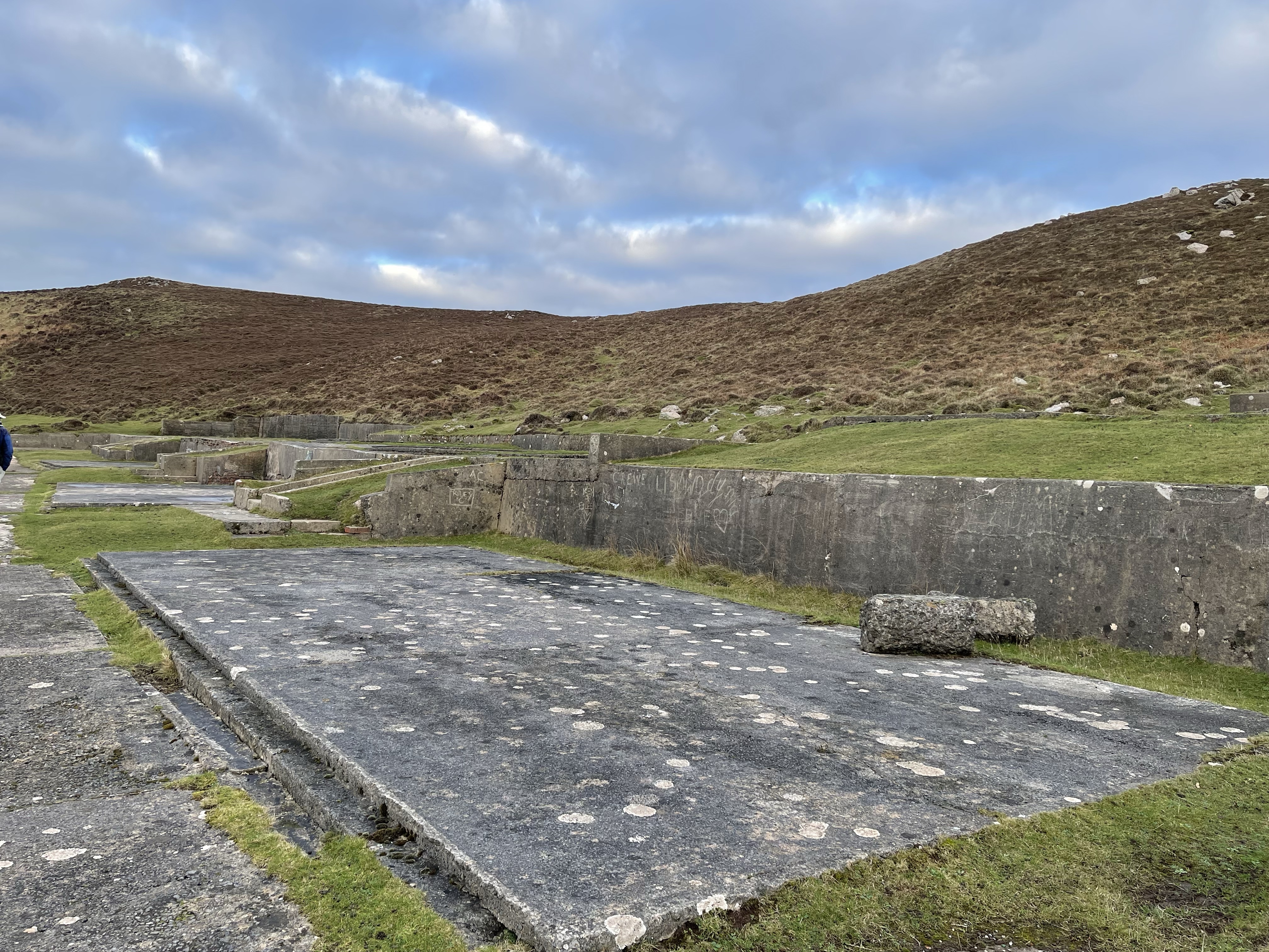 A much needed lunch break was taken at some picnic tables made of stone at the edge of an old Quarry area re designated as a car park. After this break our route was closer to the coast and became a little more interesting. However there are still signs from the quarrying and the interaction with prisoners and semi- industrial equipment. This area of coast has caves and possibly docking bays for the transport of stone and the use of lime kilns.