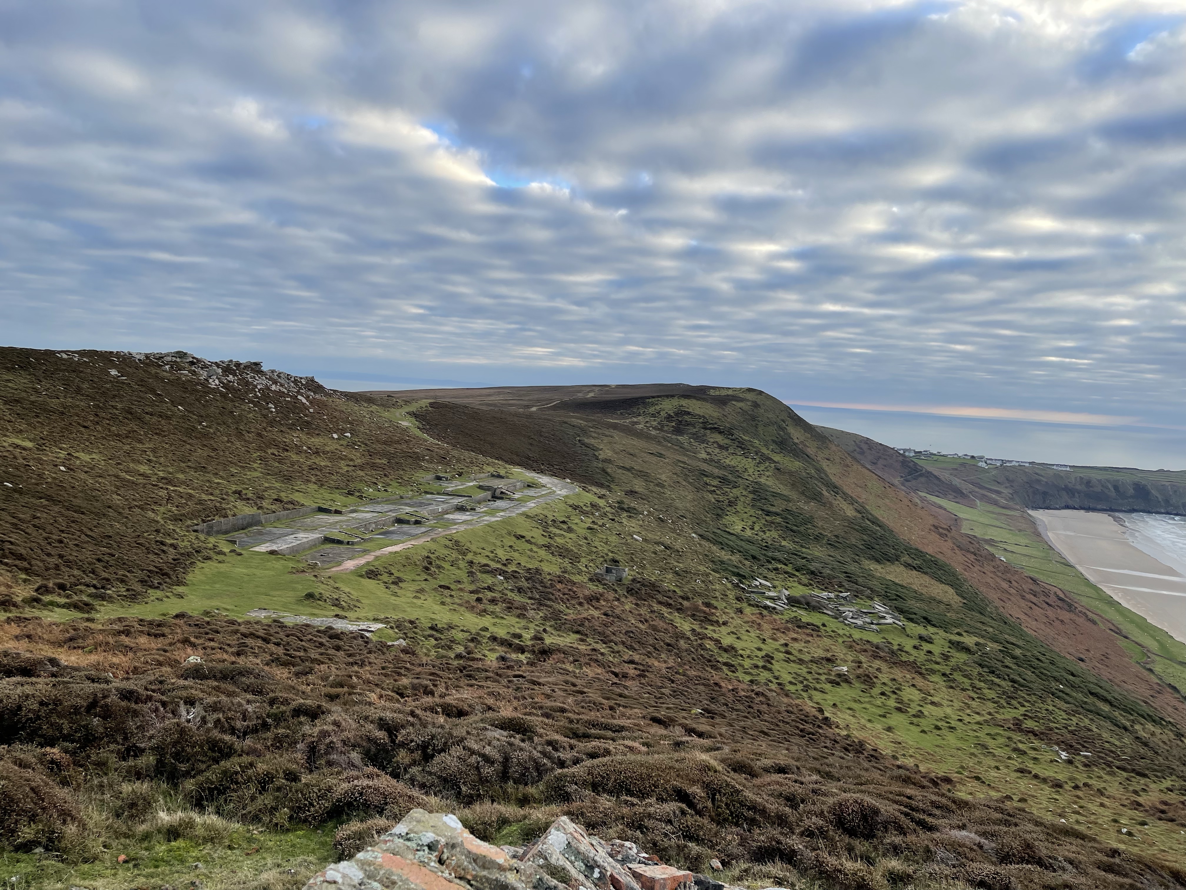 Great views down to the right and over towards Oxwich bay – this is the Gower peninsular and there are probably many good walks to be had. Not as spectacular as to our left though. We can see clearly over to Worm’s Head and down to the beach way below. Today we are walking along the ridge and before too long come to some strange concrete slabs – a little out of character. A plaque explains that this was a World War 2 radar post – quite a lonely but beautiful place to be stationed.