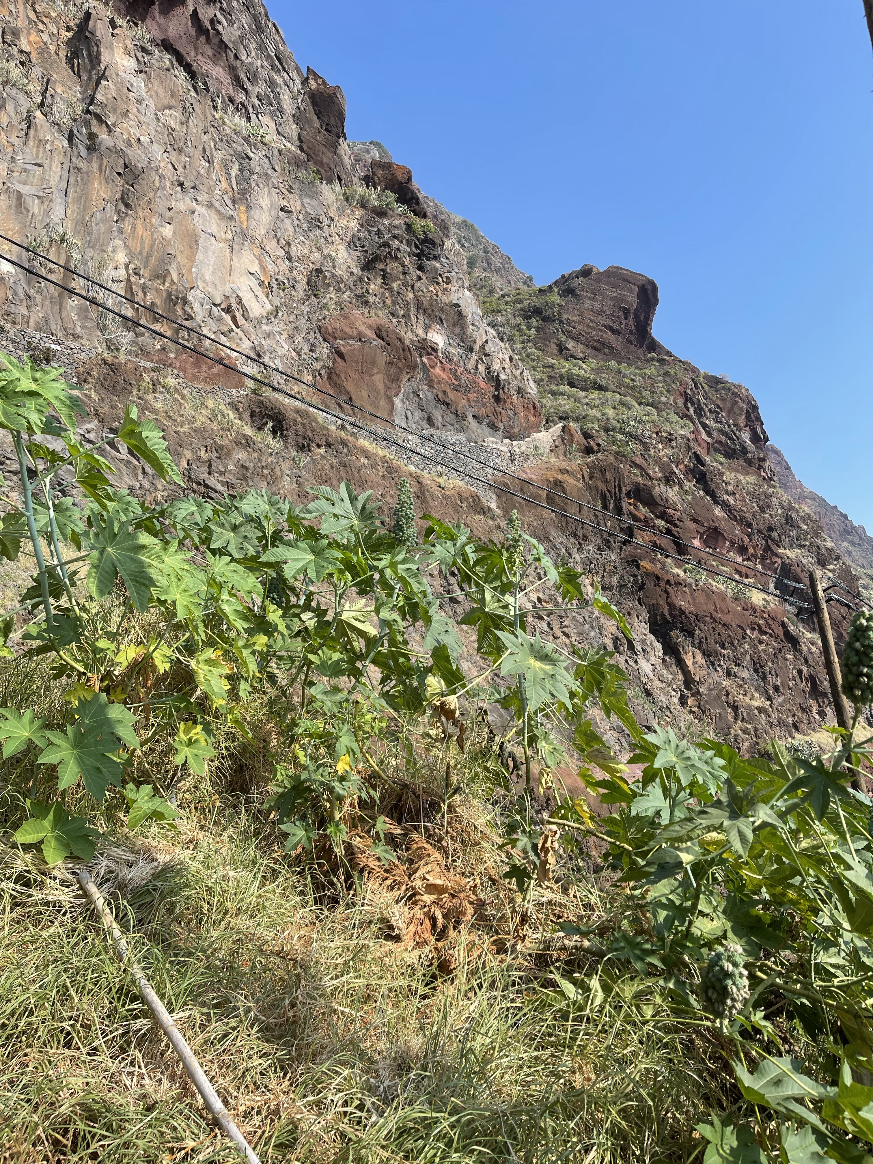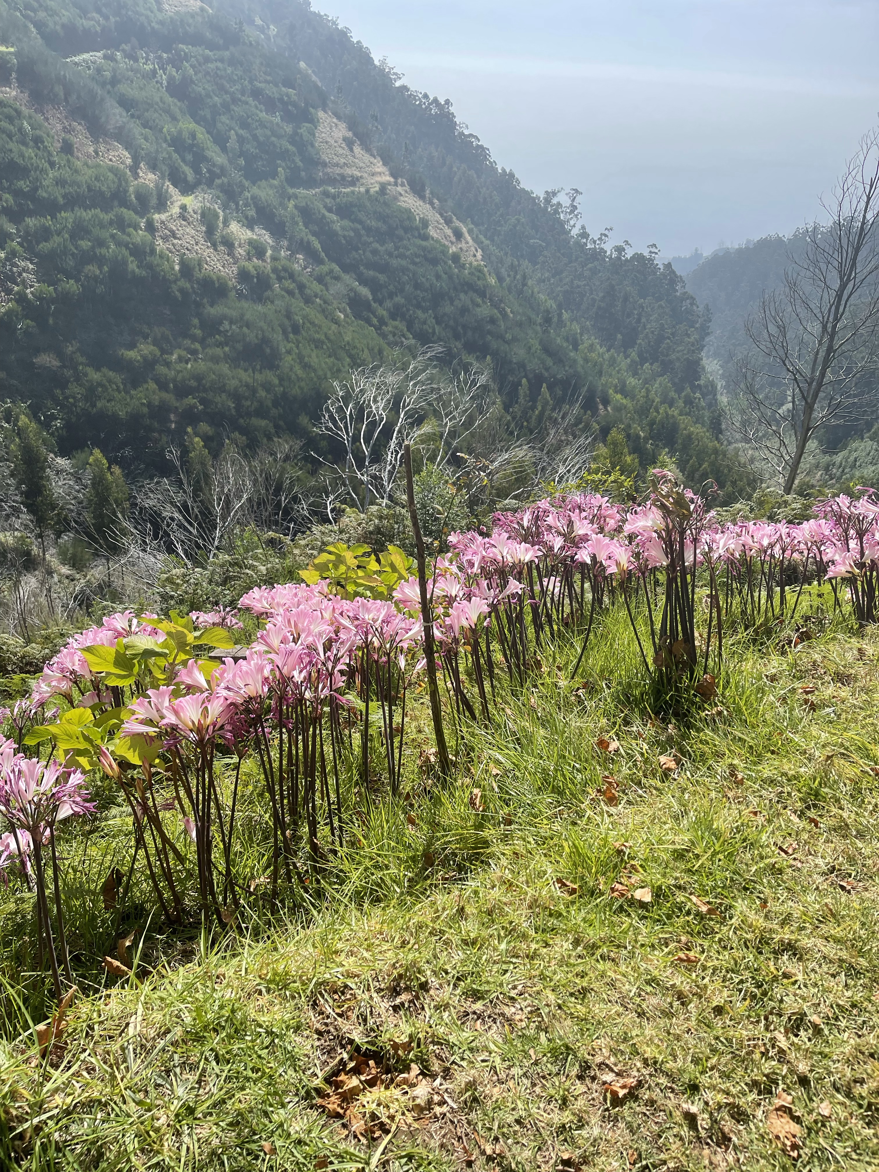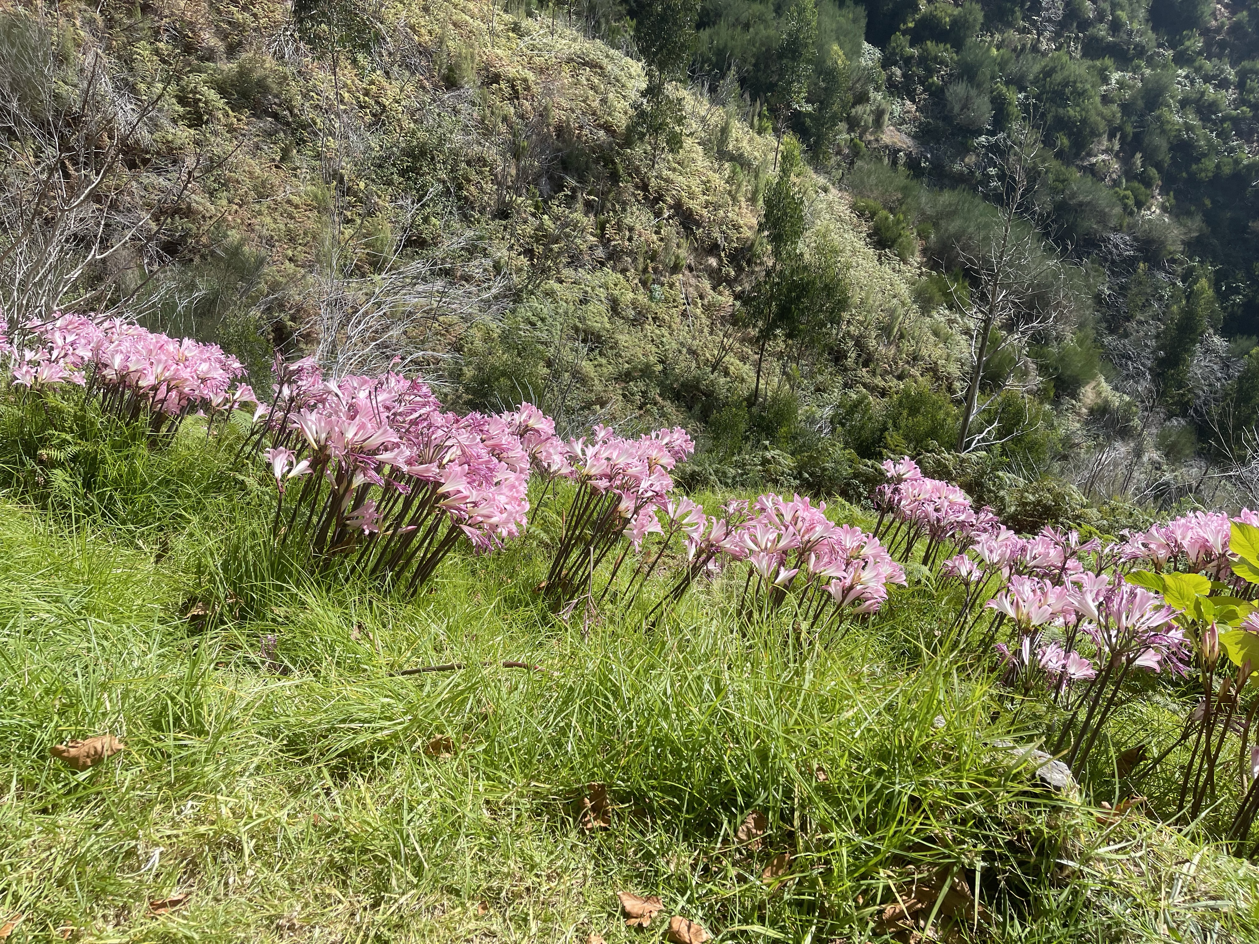 We are soon at an 800 metre tunnel under a mountain. There is an area of dedication at the entrance, luckily no rock falls or landslides during our visit! Quite wet under foot in places and with rather an ugly pipe which takes water down the mountain to a hydroelectric station. The Tunnel dos Cavaleiros takes us through to the valley of Calheta, and the site of abundant Amaryllis growing at the top of the hill.