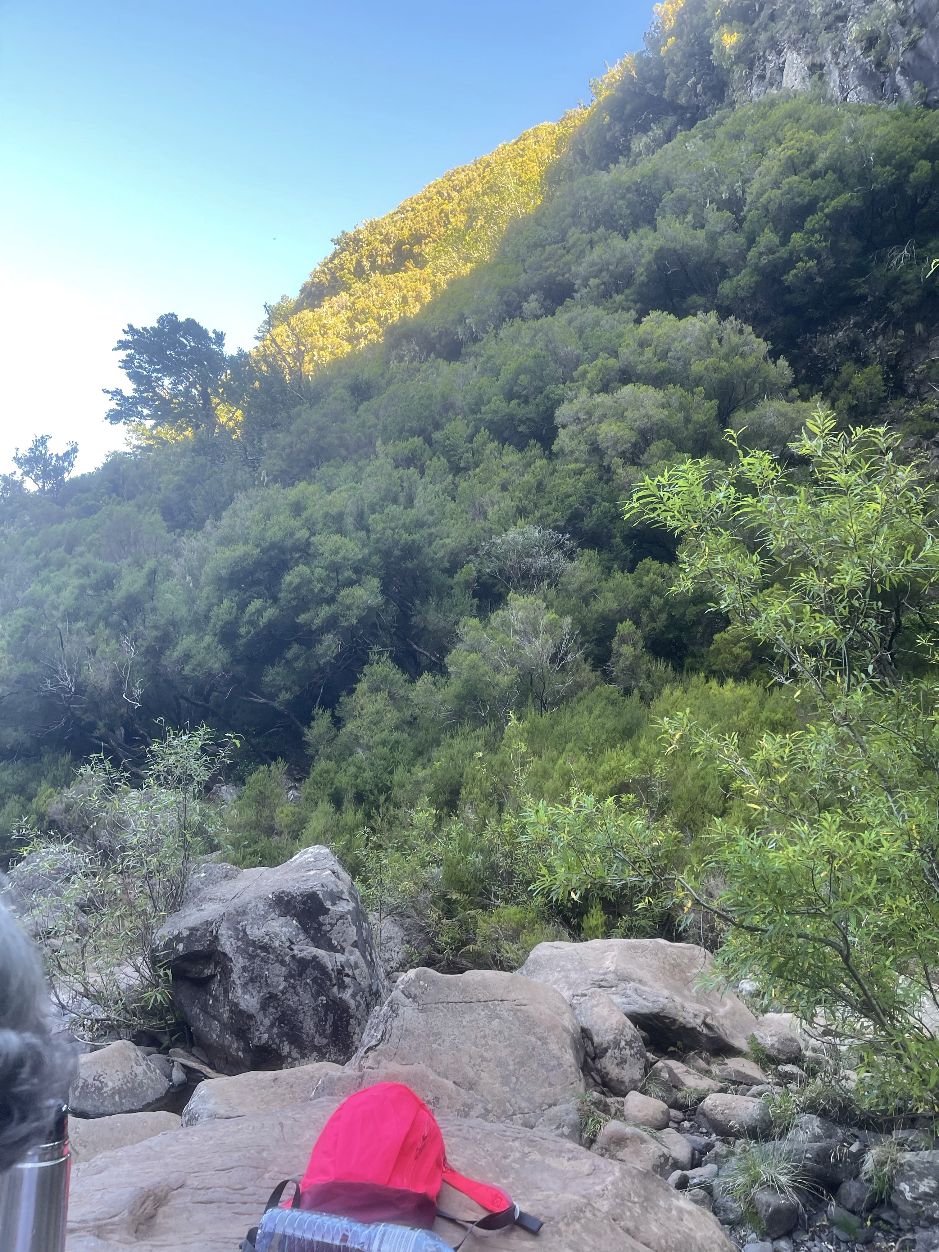 We luckily take a discrete more minor path alongside the Levada do Alecrim ( Rosemary). This turns out to be a little badly named as tree Heather predominates and the Rosemary is much more like a wild thyme! It is already quite warm and there is some welcome shade at the start of our route.