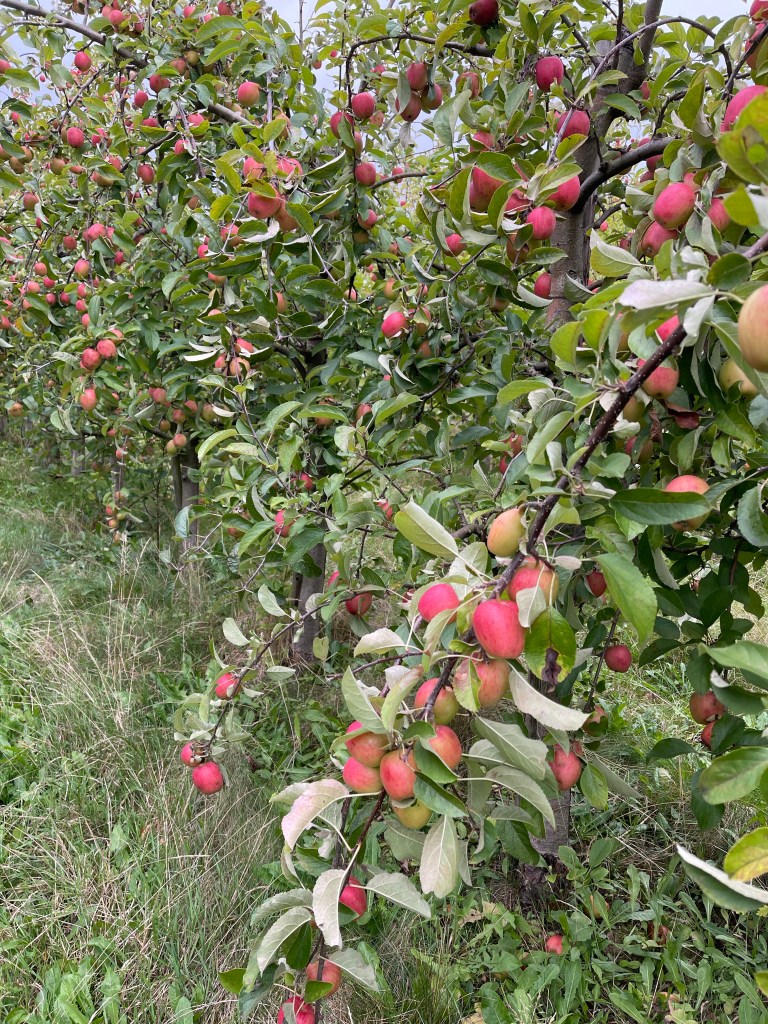 We are in the heart of an apple growing area and the first part of our walk goes alongside trees ladened with fruit. These apples are often converted to cider, I try one and it has a good taste – already feeling quite hungry as we left Millets at 8 am and we have set off on our walk at 12.15!! several different varieties of apples are growing as we proceed through the orchards.