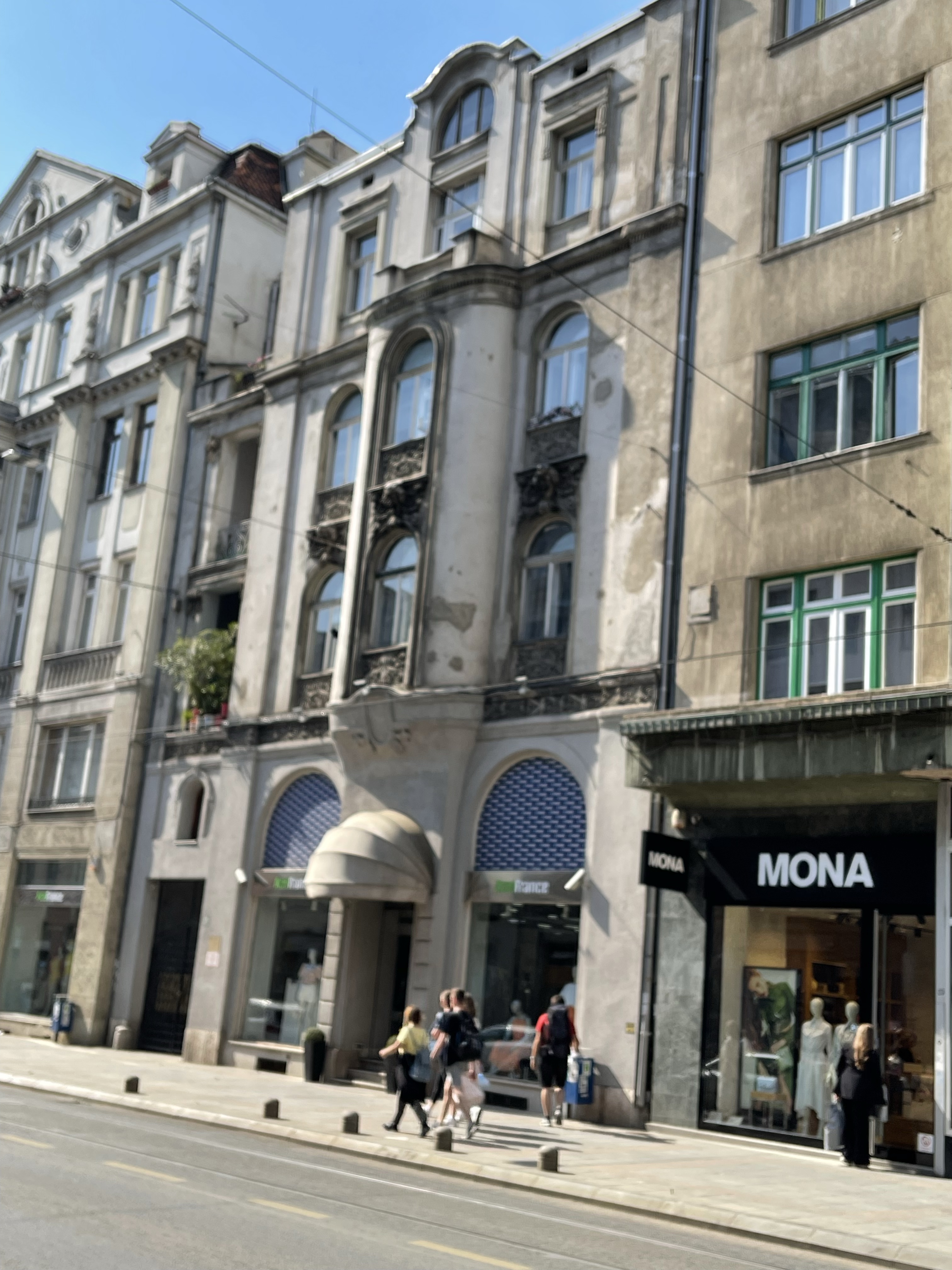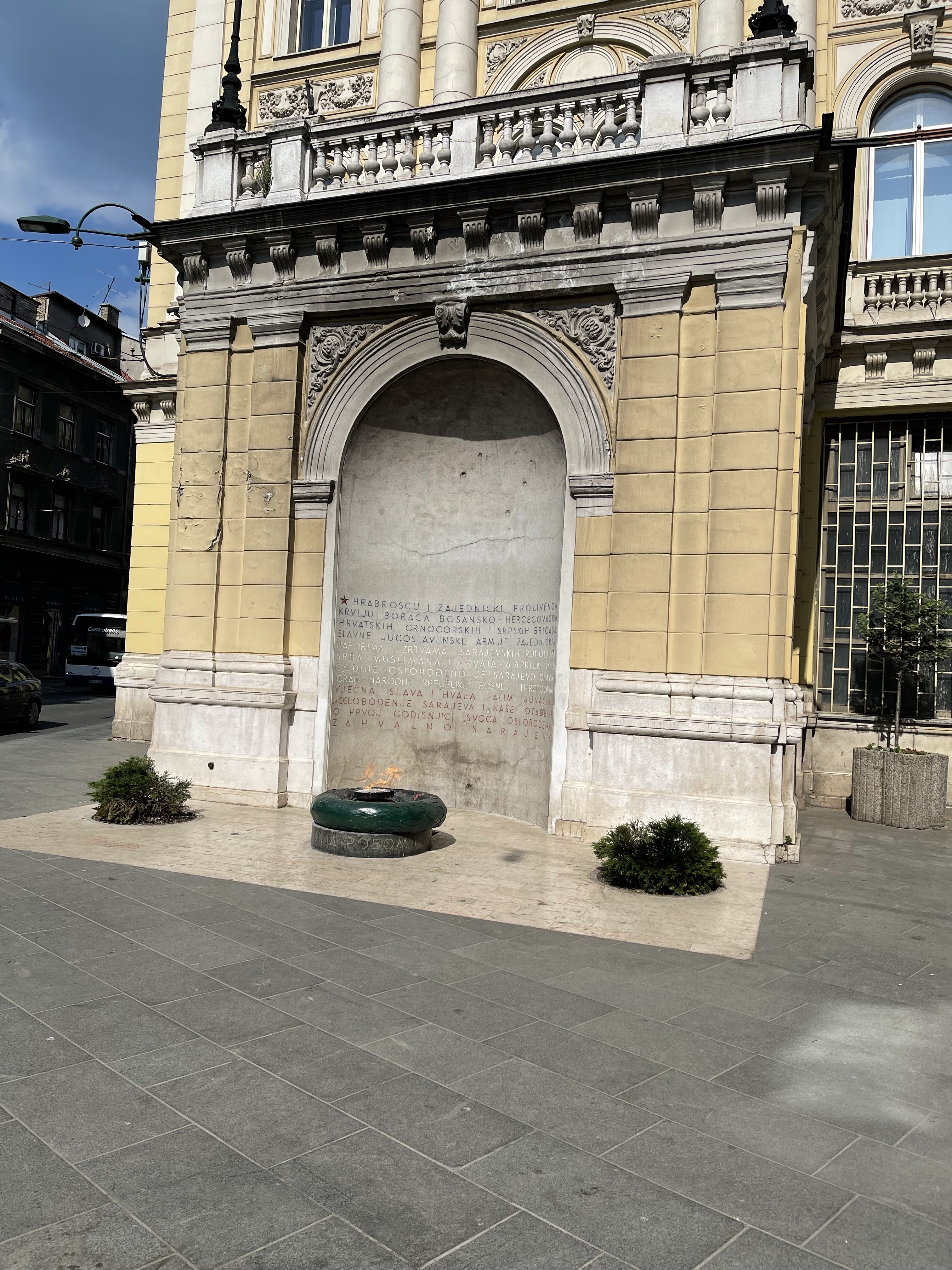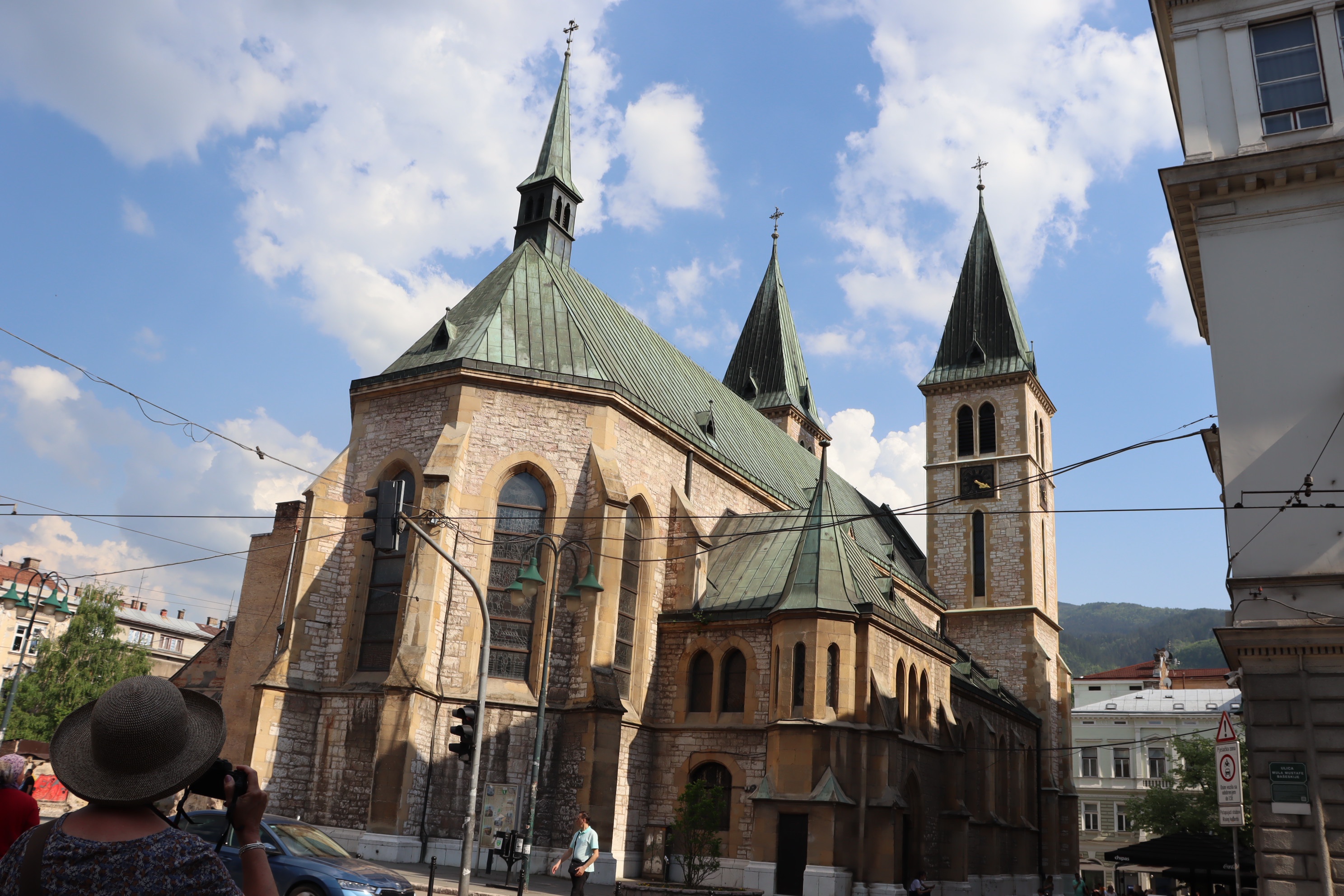 Now for some more restful ventures. Firstly the Catholic Cathedral and then into an area developed during the time of the Austro Hungarian Empire. Here as well as seeing some magnificent architecture, we also saw the Eternal Flame, the City Market and then the open air market. We spotted the concert hall and then walked passed the Bosniak Institute. Bosniaks is the name given to the Bosnian Muslims. Time for a drink!